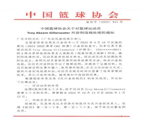 中国篮球协会根据国家体育总局《反兴奋剂规则》的有关规定,给予吉伦沃特禁赛3个月的处罚,禁赛期自2025年10月13日至2026年1月12日;对运动员管理单位广东东阳光队(广东宏远篮球俱乐部)警告,并负担20例兴奋剂检测费用(人民币:36000元)的处罚。