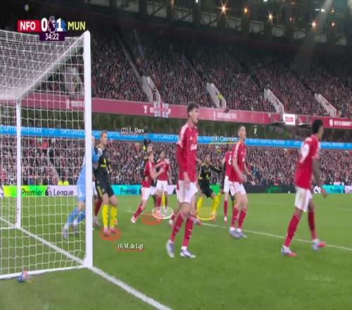 另一个例子来自本月2-2战平诺丁汉森林的客场比赛。对手采用纯粹的区域防守,内科-威廉斯、耶茨和吉布斯-怀特负责防守后点区域。