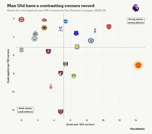 然而,他们的进攻角球得分率(每100次角球攻入14.3球)在2025-26赛季的英格兰顶级联赛中高居榜首。