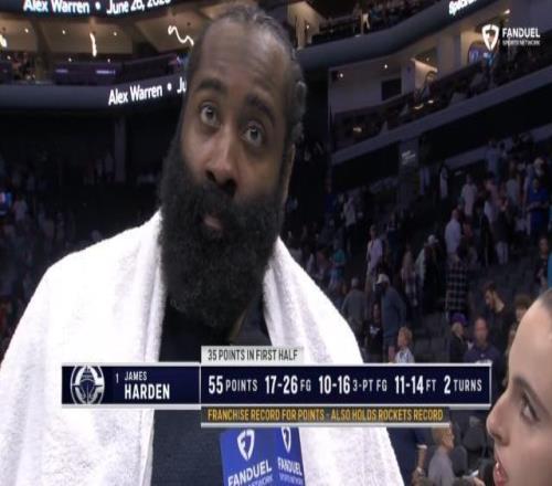 在这一战中,36岁的哈登首节就爆发,单节命中5记三分拿下27分,帮助球队建立领先优势。黄蜂开局手感火热,前八次投篮命中七球,但很快被快艇反超。半场战罢,哈登已经轰下本赛季联盟半场最高的35分。