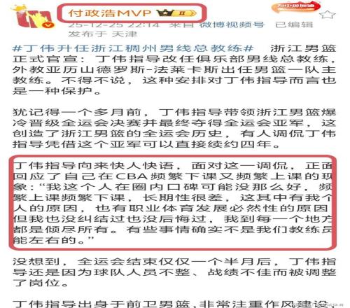 丁伟再度下课,署名媒体人付政浩在社交媒体透露,在全运会后,丁伟就曾回应自己频繁下课的原因。““我这个人在圈内口碑可能没那么好,频繁上课频繁下课,长期性很差,这其中有我个人的原因,也有职业体育发展必然性的原因,但我也没纠结过也没后悔过,我到每一个地方都是倾尽所有。有些事情确实不是我们教练员能左右的。”。