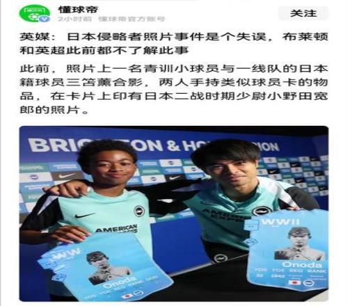 环球时报消息,据英国广播公司(BBC)11月29日报道,英超布莱顿俱乐部当天就其社交媒体上一张引发争议的图片道歉,图中,日本国脚三笘薰与一名小球员各自手持一张印有二战时日本军官小