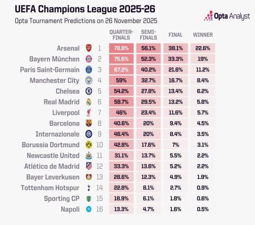 欧冠夺冠概率更新:阿森纳22.6%领跑,拜仁第二巴黎第三